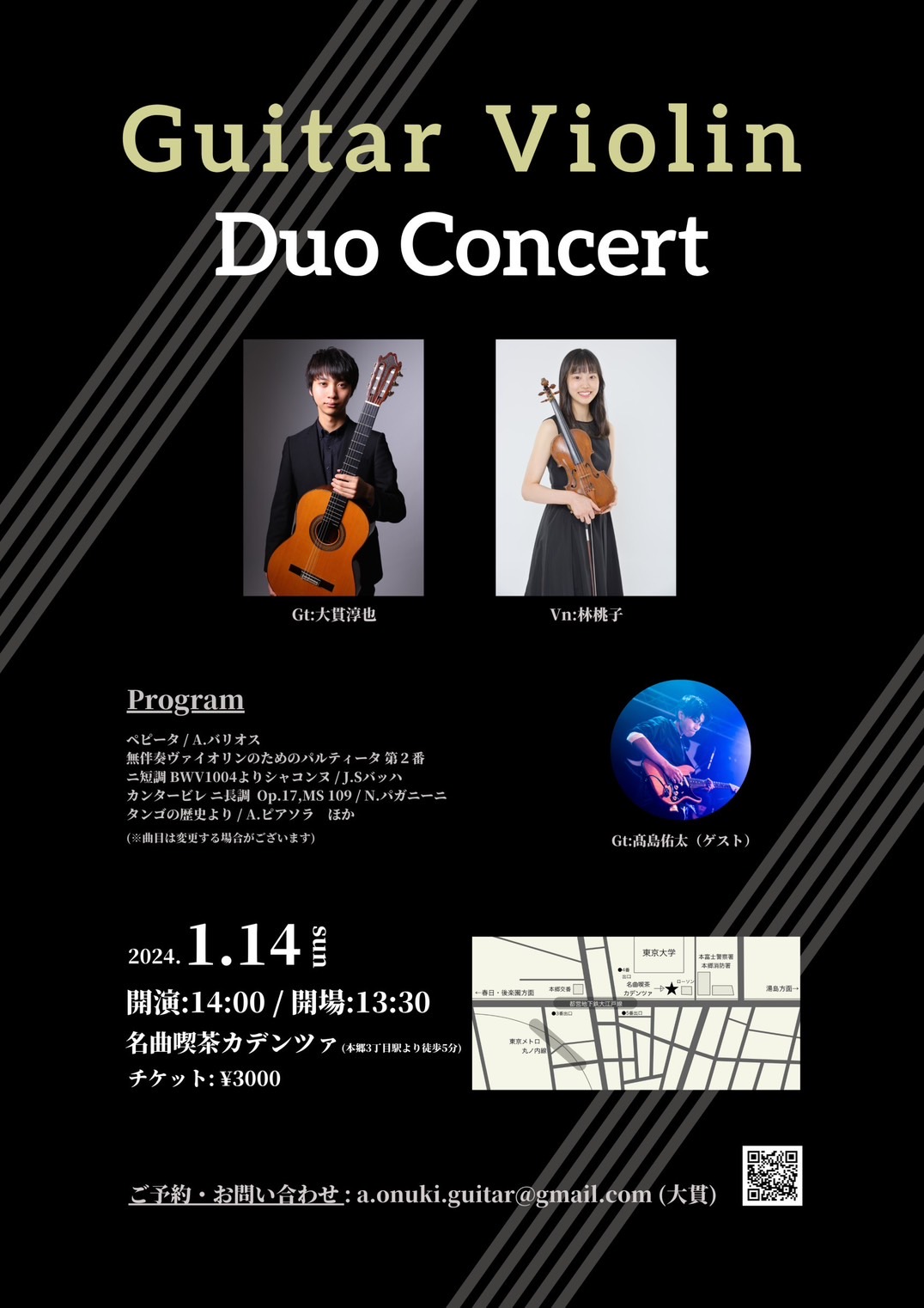 2024.01.14(Sun) Guitar Violin Duo Concert SCHEDULE 2024.05.052024.06.03 Guitar Violin Duo Concert出演:大貫淳也、林桃子(Vn)ゲスト:髙島佑太(Gt) 日時:2024年1月14日(日) 開場:13:30 開演14:00料金:3000円会場:名曲喫茶カデンツァ