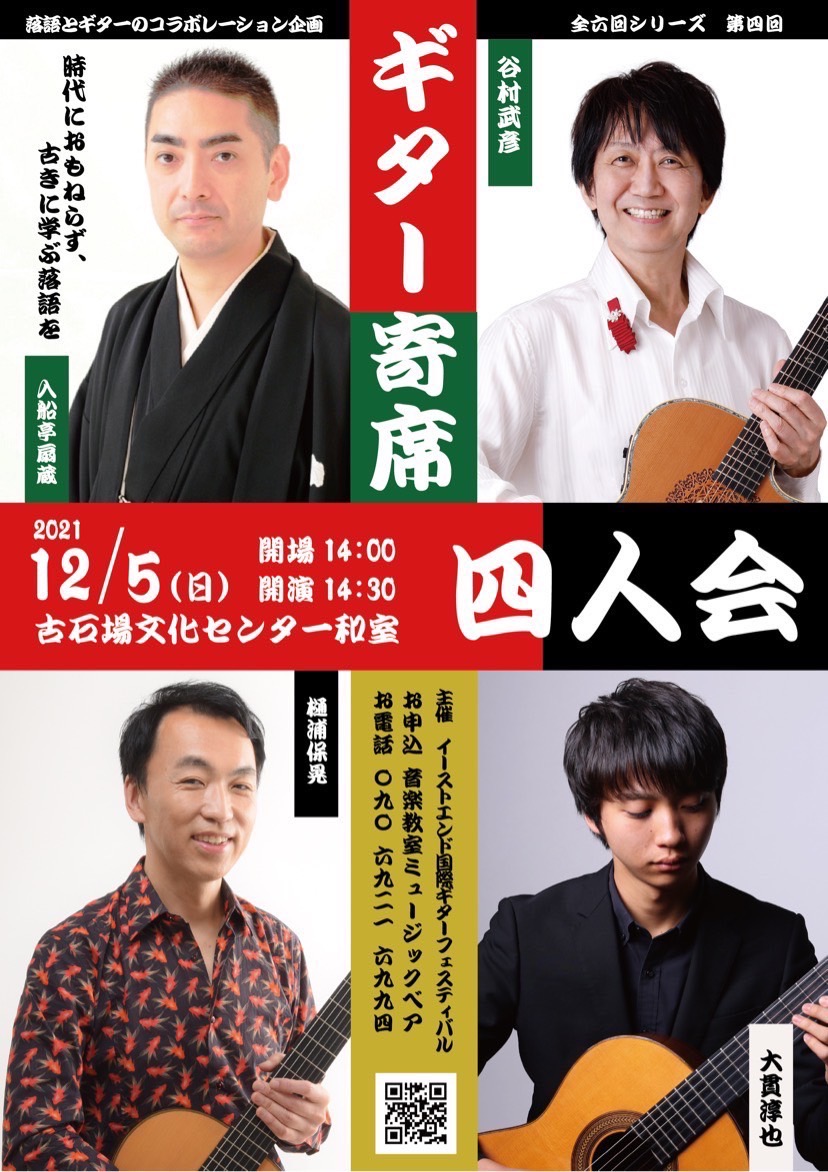 2021年12月5日 (日) ギター寄席 四人会 SCHEDULE 2024.05.052024.06.03 ギター寄席 四人会出演:入船亭扇蔵 (落語家)、谷村武彦、樋浦靖晃、大貫淳也 (ギター) 日時:2021年12月5日(日)開場:14:00 開演14:30会場:古石場文化センター和室