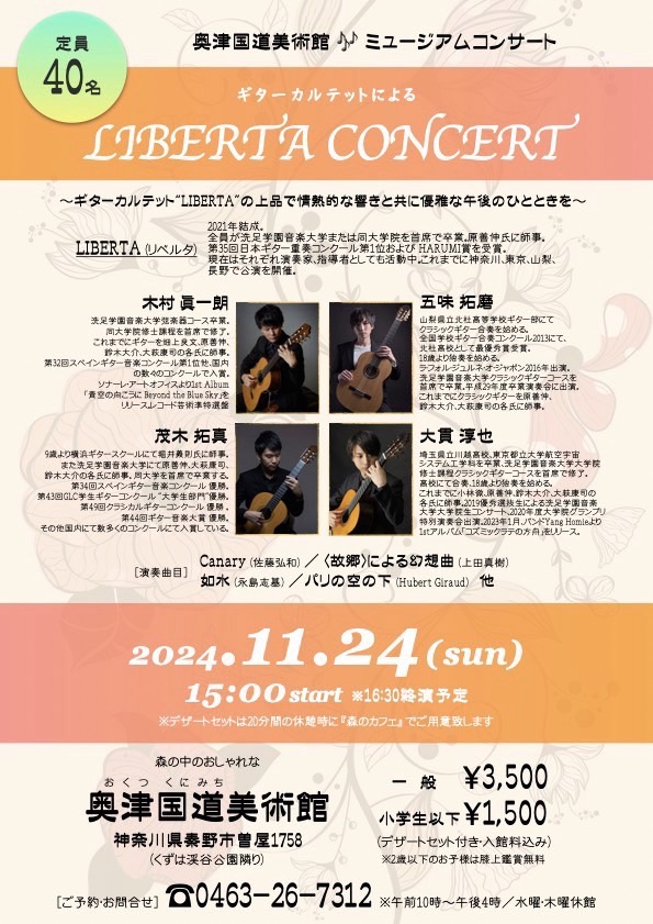 2024.11.24(Sun)奥津国道美術館ミュージアムコンサート SCHEDULE 2024.09.20 出演:リベルタ(木村眞一朗、五味拓磨、茂木拓真、大貫淳也) 11/24 (日) 奥津国道美術館(神奈川県秦野市曽屋1758) 一般 ¥3,500 小学生以下 ¥1,500 予約 : 0463-26-7312