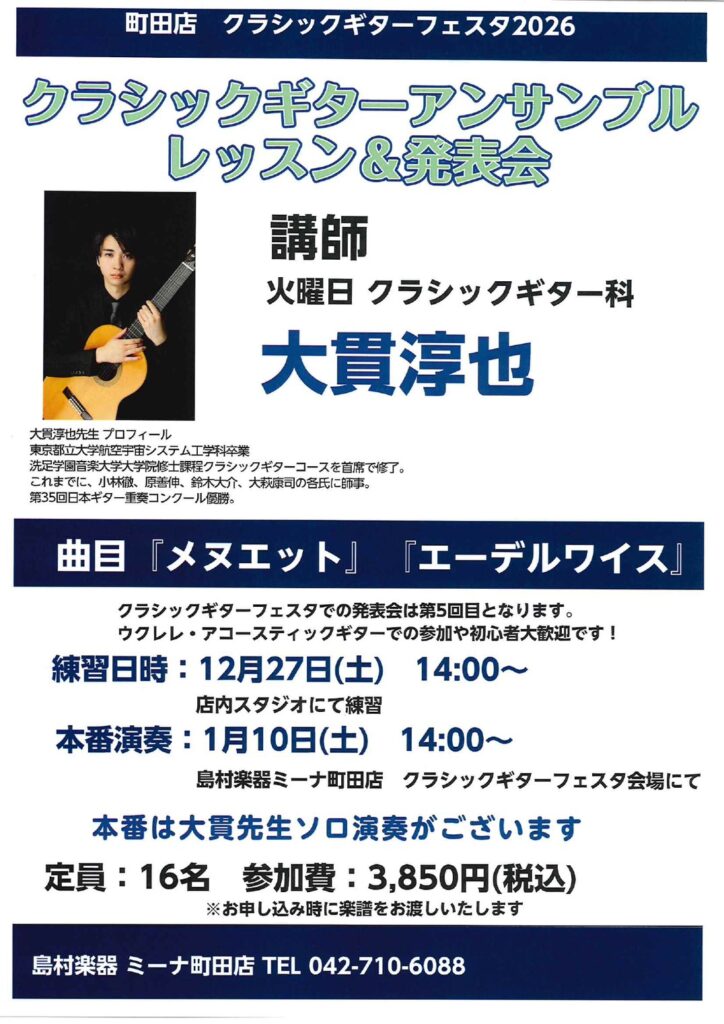 島村楽器 クラシックギターフェスタ2026 クラシックギターアンサンブル レッスン&発表会 SCHEDULE 2025.11.20 またまた島村楽器ミーナ町田店にて、「クラシックギターアンサンブル レッスン&発表会」を開催します! クラシックギター、ウクレレ、アコースティックギターでゆるく楽しくアンサンブルをする会です。 すでに定員には達してしまったのですが、聴くのは無料なのでぜひ遊びに来てください! ソロも弾きます! お待ちしています。