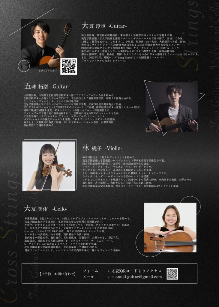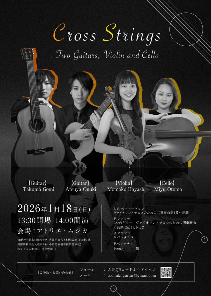 日時:2026年1月18日(日) 13:30開場 14:00開演場所:アトリエ・ムジカ入場料:大人¥3,500 学生¥2,500こちらは「Cross Strings -Two Guitars, Violin and Cello-」のご予...