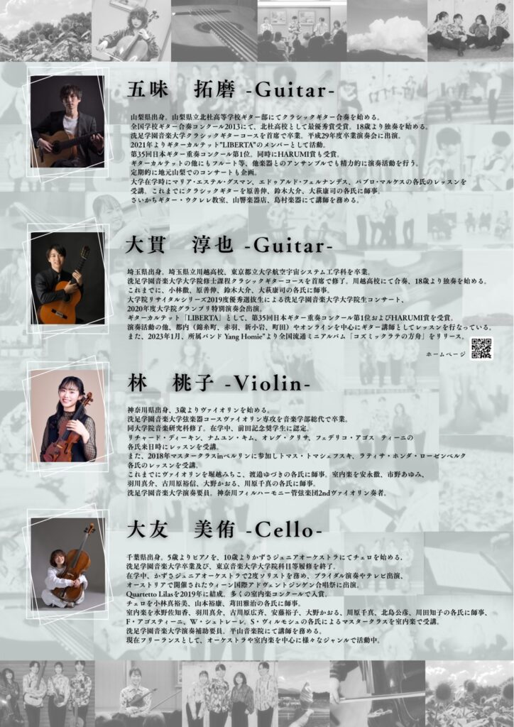 2026.07.19(sun) Cross Strings 「ヴァイオリン、チェロと2つのギター」 山梨公演 SCHEDULE 2026.04.05 出演:五味拓磨、林桃子、大友美侑、大貫淳也 日時:2026年7月19日(日)開場:13:30 開演14:00料金:一般3500円/学生1500円会場:千の森「Ruheホール」